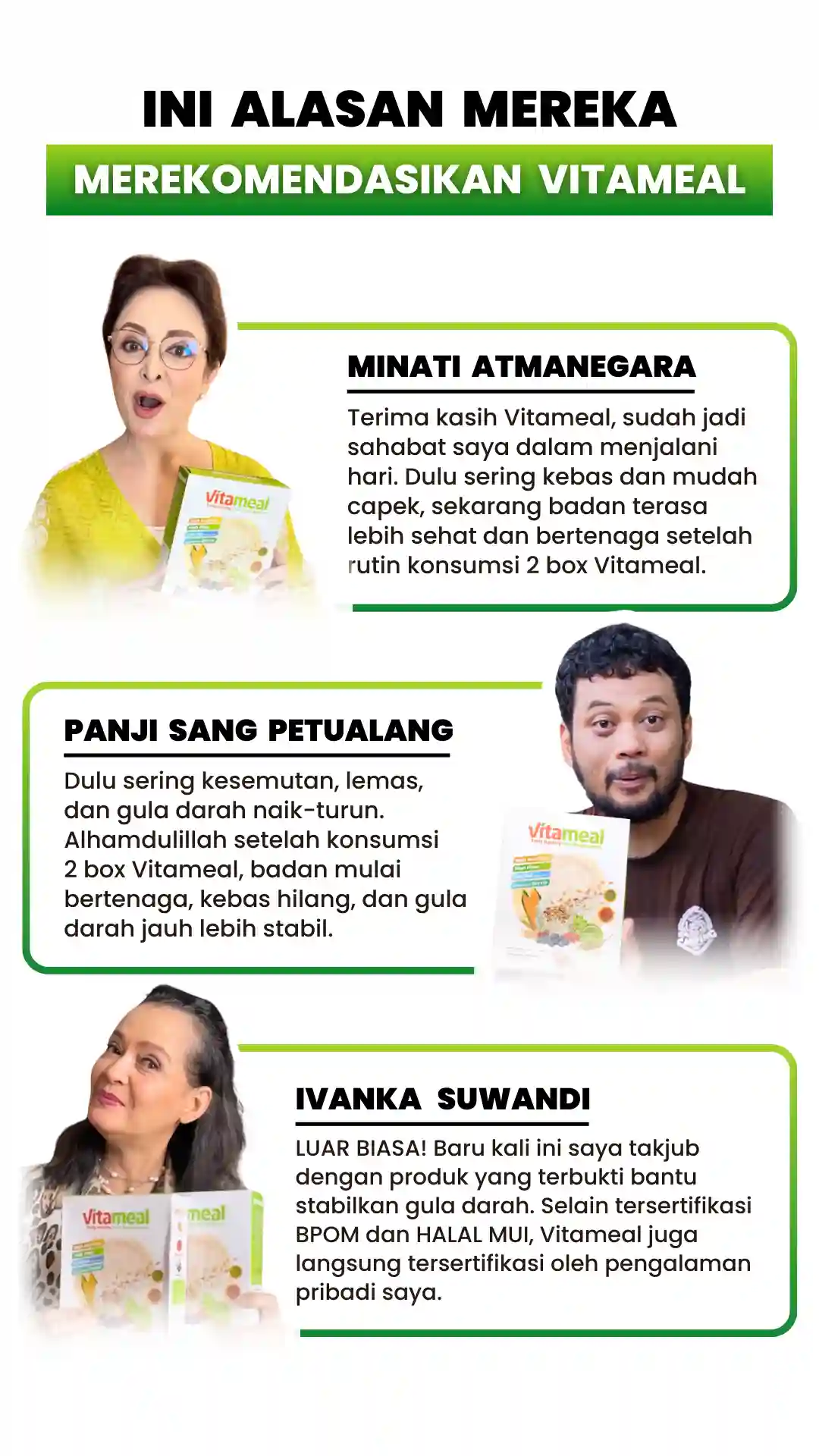Karena itu, para tenaga medis kini merekomendasikan Vitameal sebagai pendamping pengobatan yang aman dan efektif bagi mereka yang ingin hidup lebih sehat tanpa takut gula darah naik.